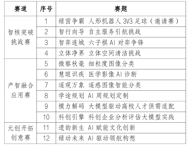 本次大赛设三大赛道,共12个赛题,覆盖AI技术攻关、行业应用及创新创意方向。
