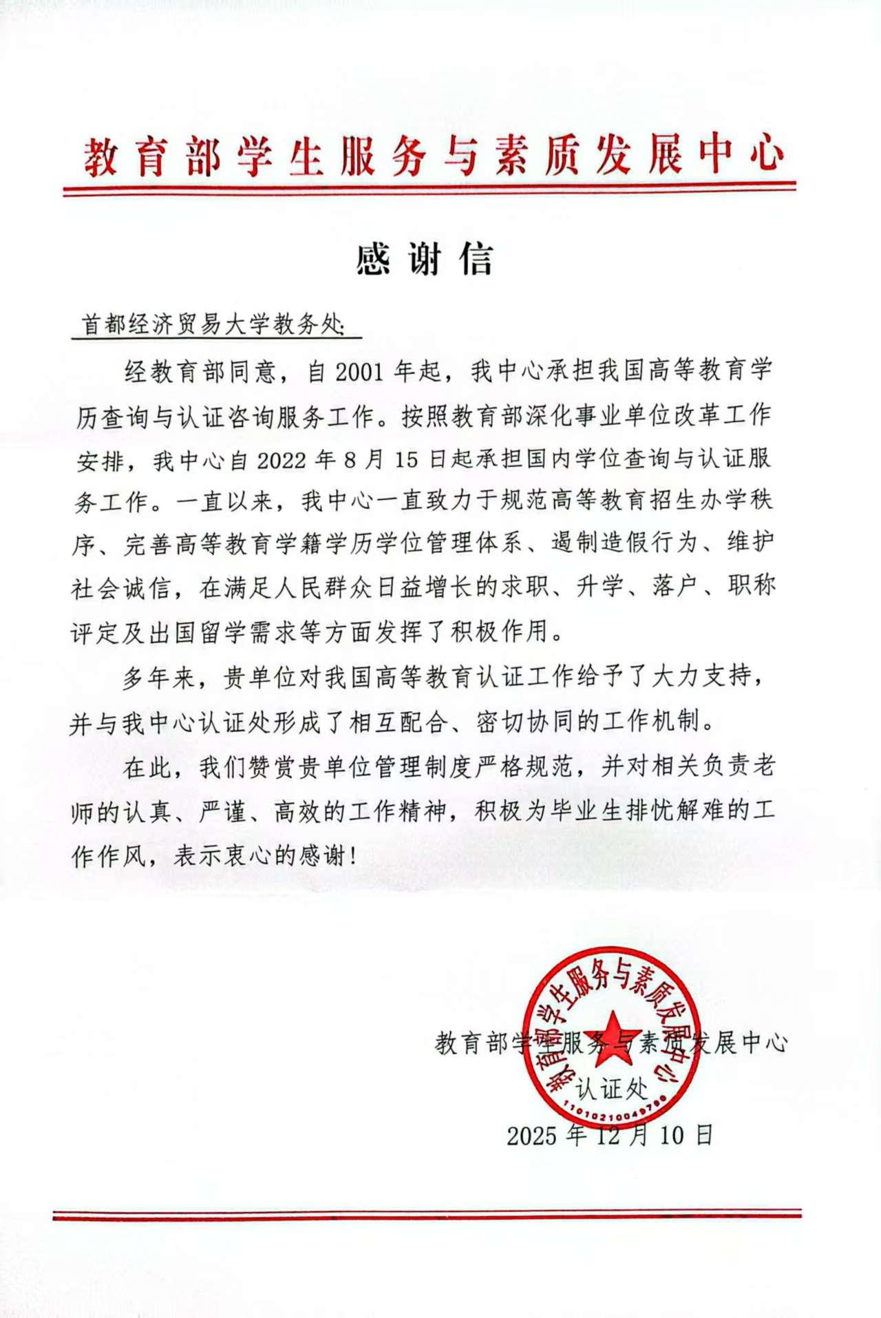 近日,我校教务处收到教育部学生服务与素质发展中心的感谢信。信中对教务处在高等教育认证工作中给予中心的大力支持表示感谢,对我校完成在校生与毕业生的成绩校对工作,积极服务学生求职、落户、留学等多元需求方面表示肯定。