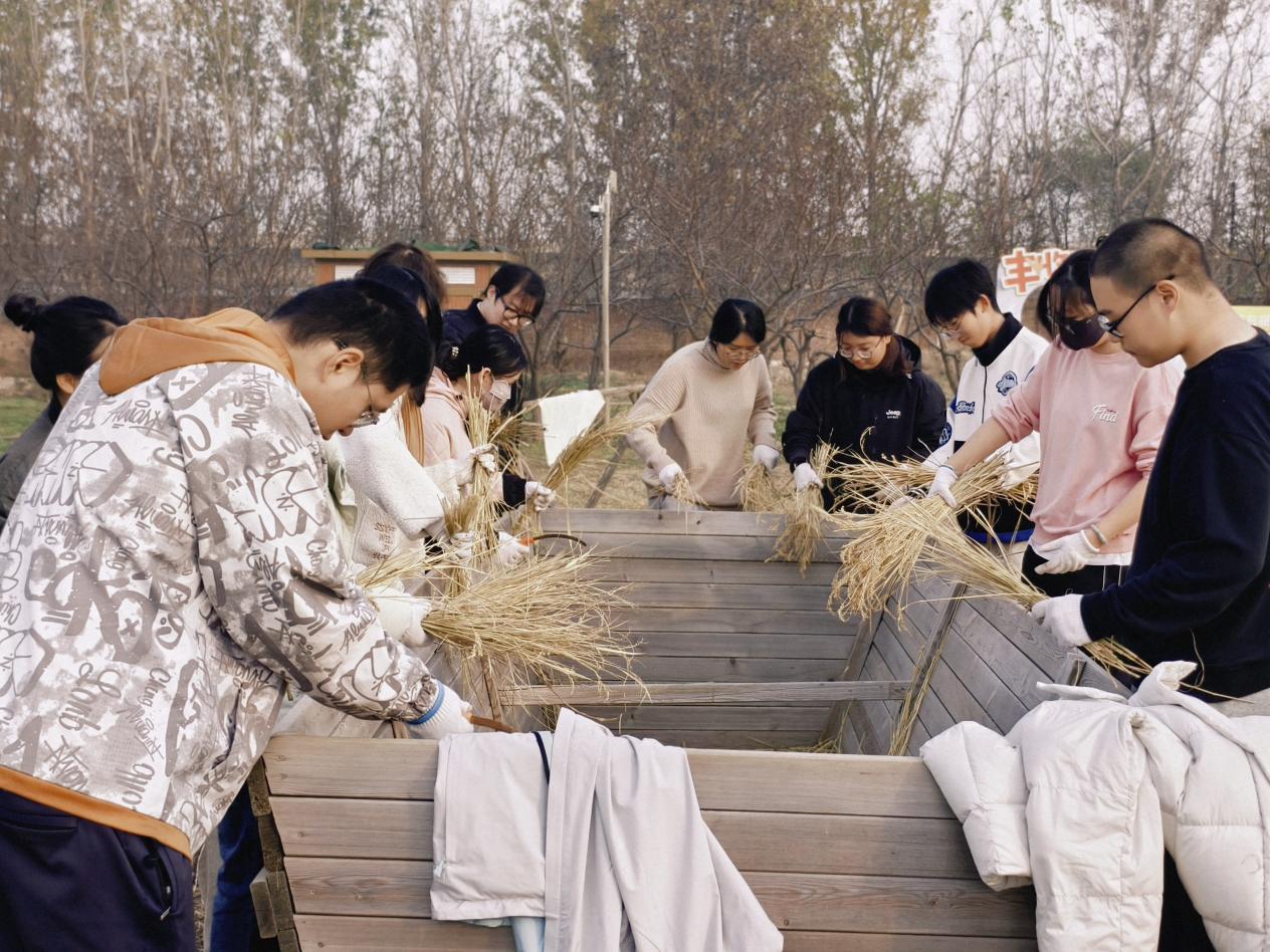“稻田农夫”环节聚焦两项任务:小麦收割区,师生跟随指导学习握镰、下割、归拢等规范动作,在金黄麦浪中完成收割;树木养护区,师生按“均匀涂抹、高度适中”要求,为树干涂刷保护白漆,助力树木抵御严寒,现场劳作氛围浓厚。