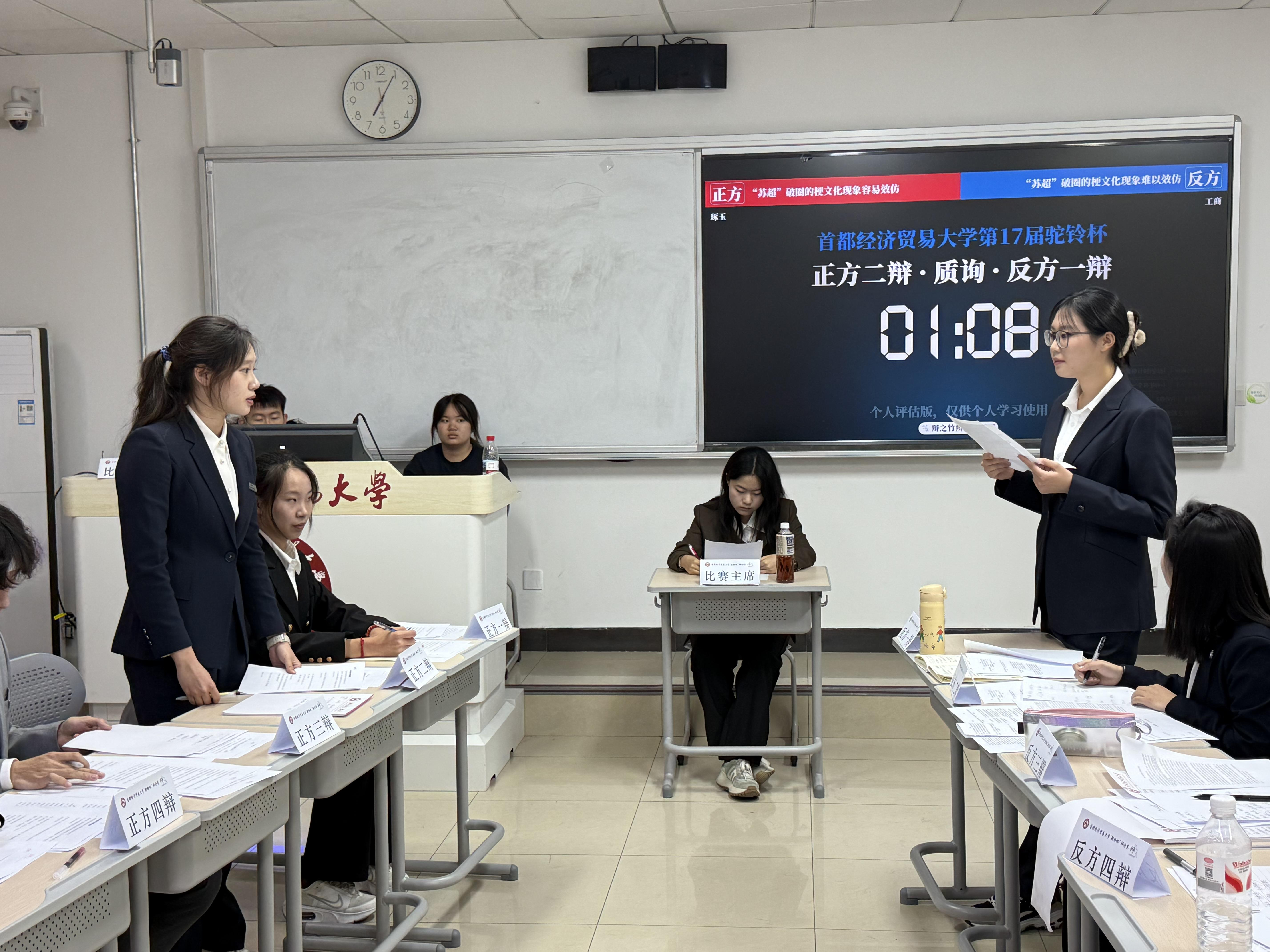 近日,第十七届首都经济贸易大学“驼铃杯”辩论赛复赛激烈开赛。琢玉书院辩论队(正方)围绕“苏超破圈的梗文化现象容易/难以效仿”的核心辩题,与工商管理学院辩论队(反方)展开巅峰对决。最终,琢玉书院辩论队凭借严密的逻辑架构、默契的团队协作与出色的临场发挥战胜对手,成功晋级半决赛。