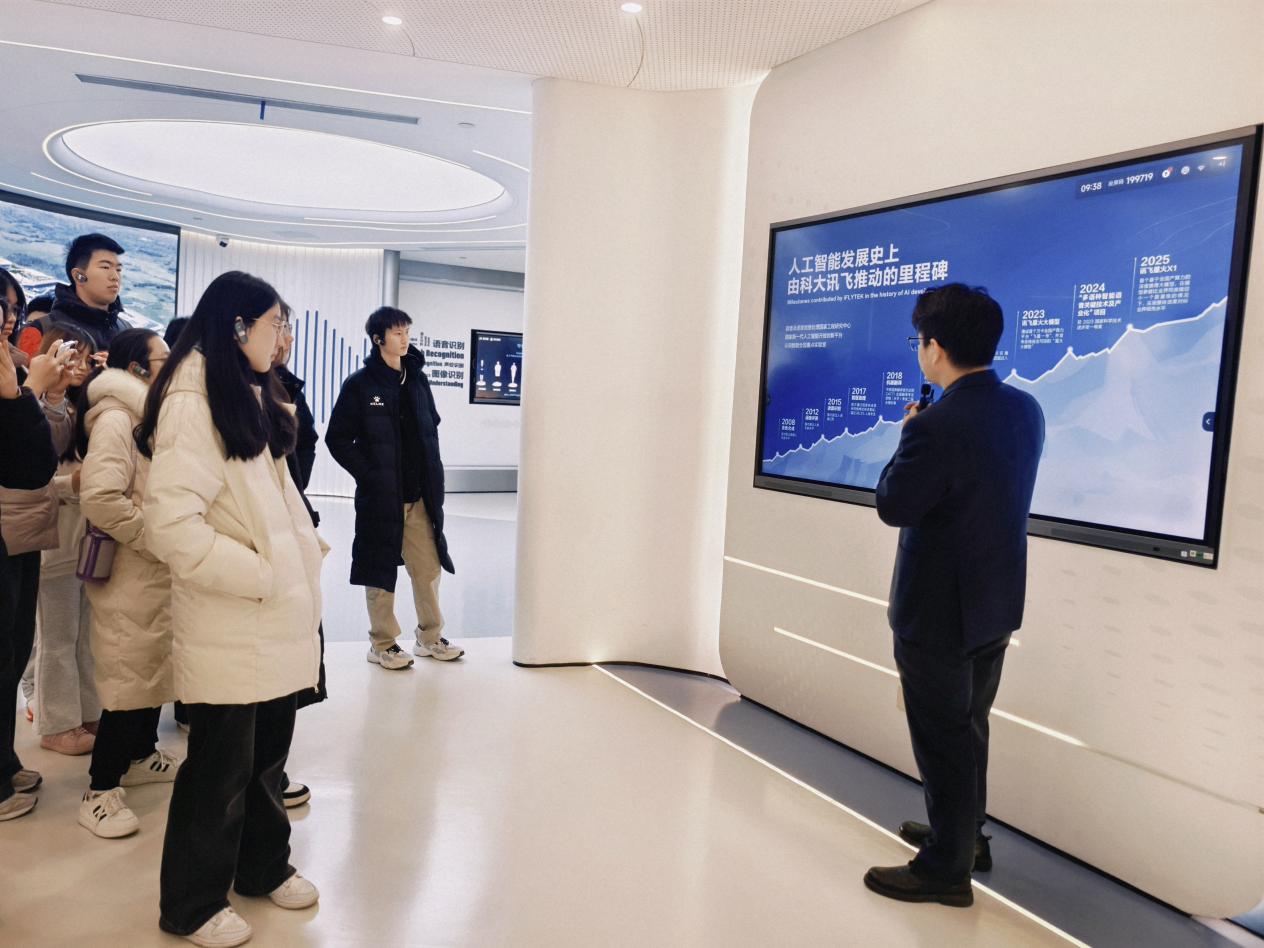 本次活动紧扣人工智能发展前沿,科大讯飞专业讲解团队全程引导,为同学们系统呈现技术研发成果与产业落地实践。参观现场氛围活跃而专注,在讲解团队的带领下,同学们依次参观了科大讯飞人工智能成果展示区与技术体验中心。从1999年公司成立至今的关键发展节点,到智能语音合成、语音识别等技术多次突破人类水平的里程碑事件,再到2023年讯飞星火大模型发布、2025年深度推理大模型星火X1升级等核心进展,详实的史料与生动的演示让同学们清晰梳理出中国人工智能的自主创新脉络。