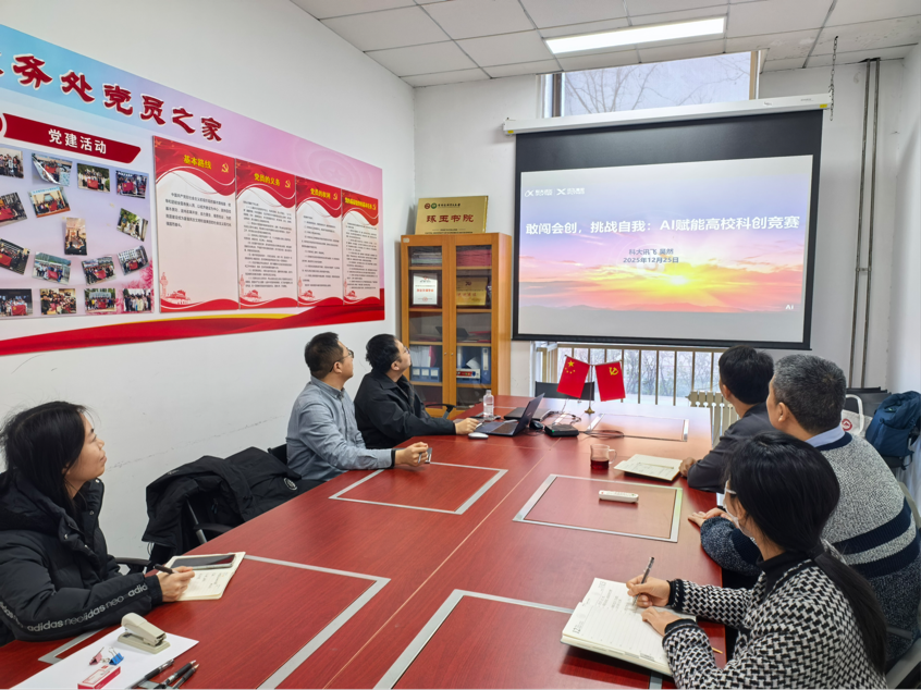 2025年12月25日上午,琢玉书院与科大讯飞(北京)关于挑战杯AI+选题经验交流座谈会在博纳楼134会议室顺利召开。本次座谈会由教务处副处长孙亮主持,教务处魏庆坡老师、刘志敏老师,琢玉书院白志清老师及统计与数据科学学院胡迪老师参会,科大讯飞(北京)高教专家吴然、许彪受邀作专题分享。