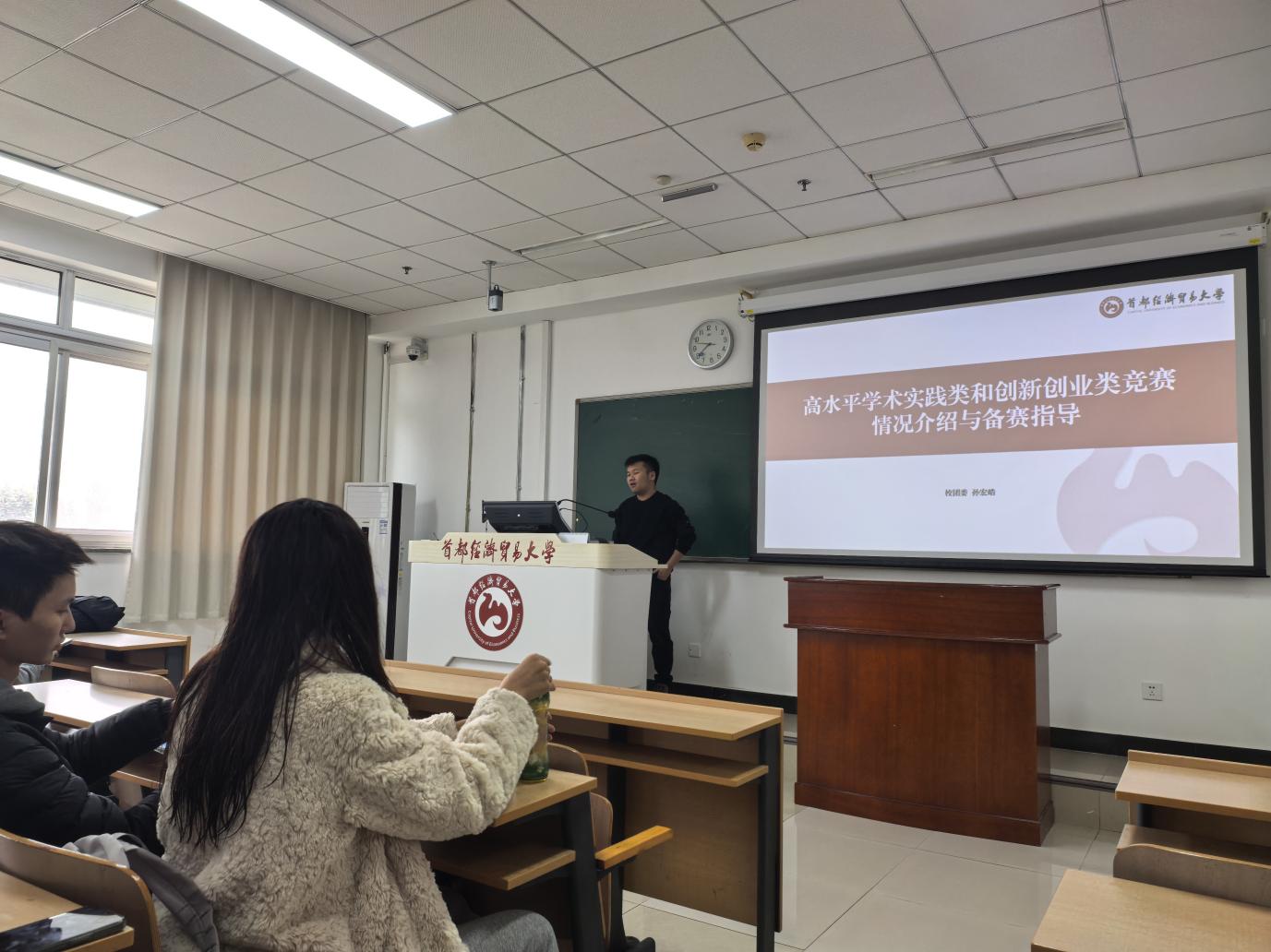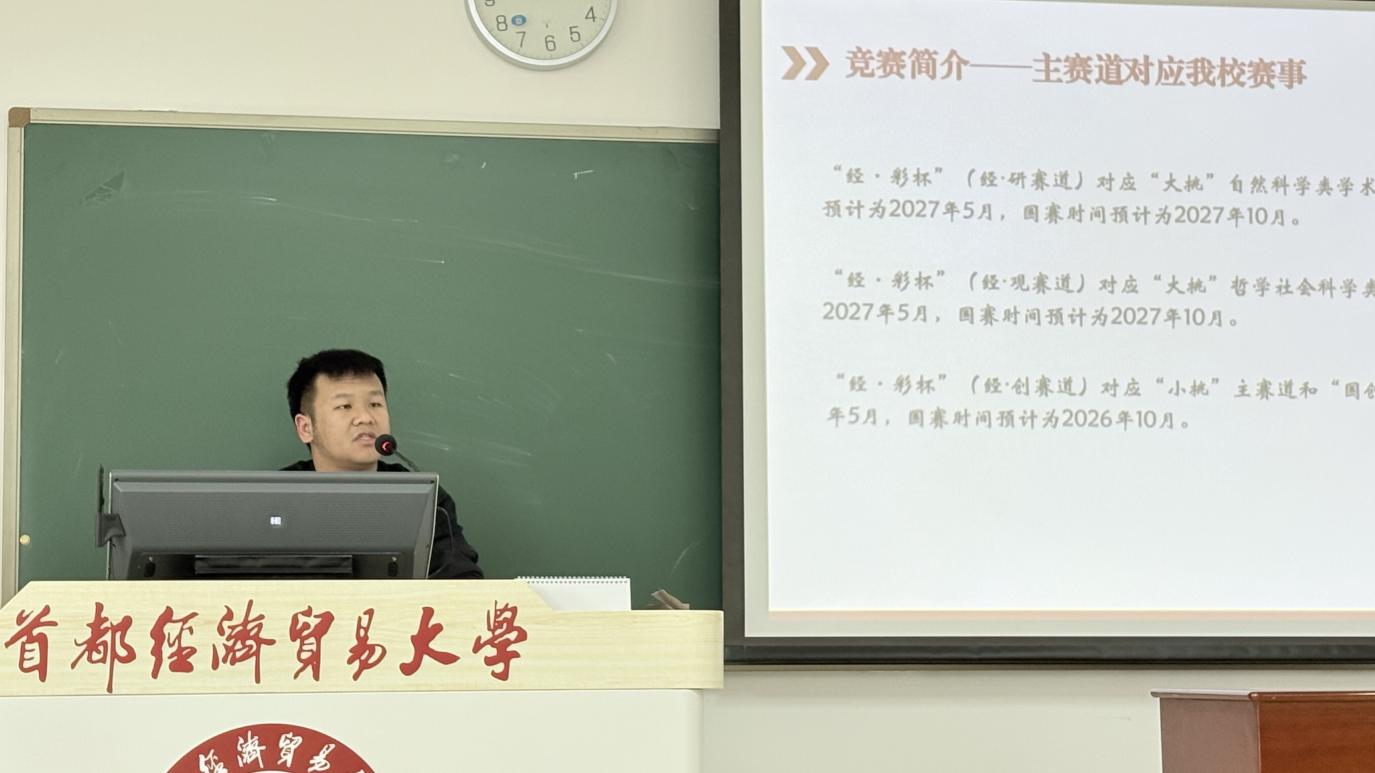 在核心指导环节,孙宏皓老师以《高水平学术实践类和创新创业类竞赛情况介绍与备赛指导》为题开展专题报告,时长 1 个半小时。孙老师结合自身丰富的竞赛指导经验,系统梳理了当前主流竞赛的类别、赛制差异及核心评审标准。其中,针对与我校紧密相关的 “经・彩杯” 系列赛事,他详细解析了不同赛道的对应方向:“经・研赛道” 对应 “大挑” 自然科学类学术论文和科技发明制作,下一届省赛预计 2027 年 5 月举办,国赛预计 2027 年 10 月;“经・观赛道” 对应 “大挑” 哲学社会科学类社会调查报告,省赛、国赛时间与 “经・研赛道” 一致;“经・创赛道” 对应 “小挑” 主赛道和 “国创” 主赛道,下一届省赛预计 2026 年 5 月举办,国赛预计 2026 年 10 月。孙老师通过列举往届优秀参赛案例,生动展示了竞赛选题的技巧 —— 如何平衡专业特色与创新亮点,如何结合社会需求确定研究方向。同时,他针对 “依据赛事日程倒排工作节点” 这一关键问题,提出 “分阶段拆解任务、明确时间节点责任到人” 的实操方法,帮助竞赛小组规避筹备过程中的时间浪费与流程混乱问题,为高效推进竞赛工作提供清晰思路。
